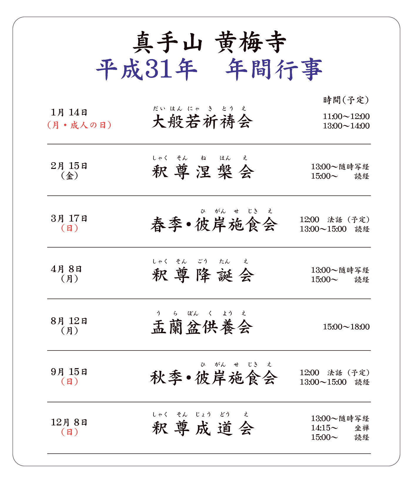 平成三一年 年間行事予定をアップしました