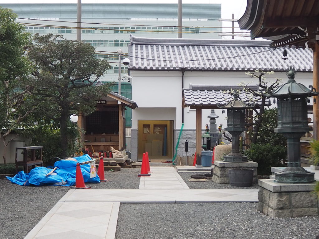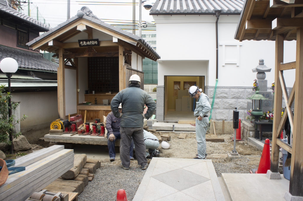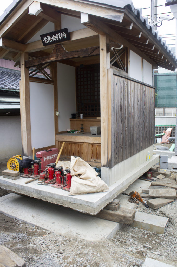 境内の西側にある地蔵堂を移動しました。 建物を壊さずそのまま移動させる曳屋工事という珍しい工事です。 施工は八尾市にある西澤組様に行って頂きました。